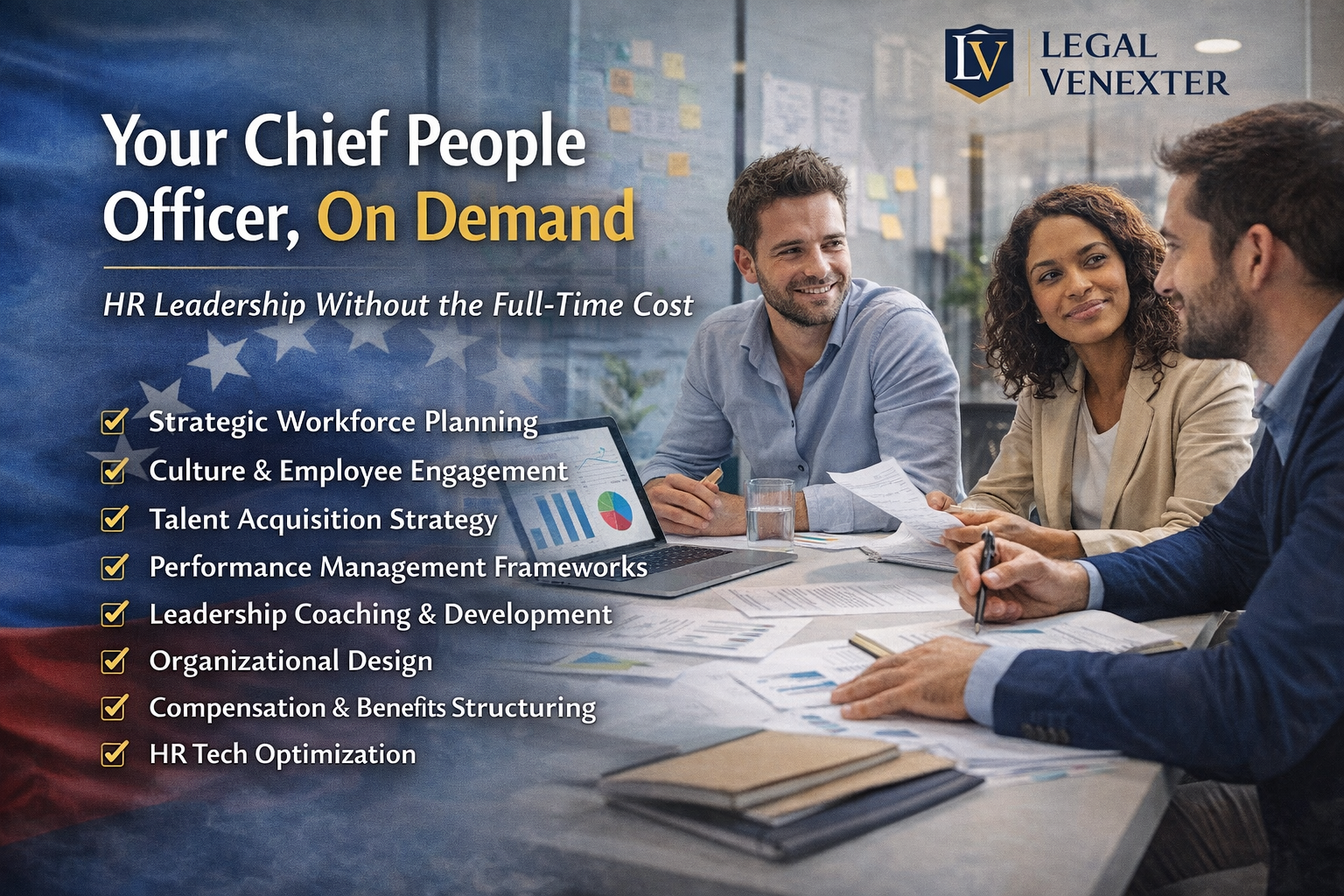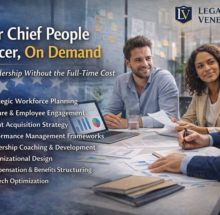 As companies grow, they reach a critical point where administrative HR management is no longer enough. Teams expand, culture becomes more complex, leaders need support… yet hiring a full-time Chief People Officer (CPO) is often not financially viable. This is where a strategic solution increasingly adopted by startups, scaleups, and transforming organizations comes in: Fractional HR Leadership — your Chief People Officer, on demand. What does it mean to have a CPO “on demand”? Having a fractional Chief People Officer means integrating a senior people leader into your organization without taking on: a full-time executive salary permanent structural costs organizational rigidity Instead, you gain a strategic partner who: participates in leadership meetings designs your people strategy supports change processes aligns talent and culture with business goals When a company grows, the challenge is no longer hiring — it’s structuring Many organizations reach a stage where: hiring fast is no longer enough internal tensions emerge roles and processes lack clarity leadership becomes overloaded culture starts to dilute The problem is not HR. It is strategic leadership in People & Culture. What a Fractional HR Leadership service delivers Our Your Chief People Officer, On Demand model integrates a senior leader into your organization to work on key areas such as: 🔹 Strategic Workforce Planning Talent planning aligned with the company’s real growth trajectory. 🔹 Culture & Employee Engagement Designing organizational culture and engagement strategies. 🔹 Talent Acquisition Strategy Building sustainable talent attraction processes. 🔹 Performance Management Frameworks Clear systems for evaluation, feedback, and development. 🔹 Leadership Coaching & Development Supporting leaders and middle management. 🔹 Organizational Design Structures that work today… and tomorrow. 🔹 Compensation & Benefits Structuring Designing competitive and sustainable compensation schemes. 🔹 HR Tech Stack Optimization Selecting and implementing digital HR tools. Fractional vs. Interim: they are not the same Choosing the right HR leadership model is essential. 🟡 Fractional Leadership Ideal when you need ongoing strategic direction without a permanent role. Long-term relationship Part-time commitment (e.g., 1–2 days per week) Focus on strategy and high-impact execution Grows with your company 🔵 Interim Management Designed for urgent situations or unexpected vacancies. Fixed-term engagement Usually requires full-time presence Focus on operational continuity Transition-oriented Both are useful. But only the fractional model builds sustained strategic value. What type of company is this service ideal for? This model works especially well for: Growth-stage startups Scaleups professionalizing their structure Family businesses undergoing transformation International organizations with remote teams NGOs and hybrid entities combining social impact with business management Legal Venexter’s approach to Fractional HR Leadership At Legal Venexter, we understand that people management today is no longer just an administrative function. It is a strategic business lever. Our Your Chief People Officer, On Demand service is built on three pillars: Executive Vision We are not “HR support.” We are part of the leadership team. Strategic and Legal Perspective We integrate people strategy with: regulatory compliance solid contractual structures labor compliance frameworks International Mindset We design solutions for teams that are: multicultural remote distributed across multiple countries The results this model delivers Organizations that adopt fractional leadership in People & Culture typically achieve: greater organizational clarity improved talent retention stronger leadership more coherent culture people decisions aligned with business strategy reduced labor and reputational risks Conclusion Today, business growth no longer depends only on sales, technology, or international expansion. It depends on how you lead your people. Having a Chief People Officer, On Demand gives you access to high-level leadership in people strategy—without the rigidity or cost of a permanent executive position. At Legal Venexter, we believe strong organizations are built on: strategy, culture, and solid human leadership. And that starts with taking the People & Culture function seriously.